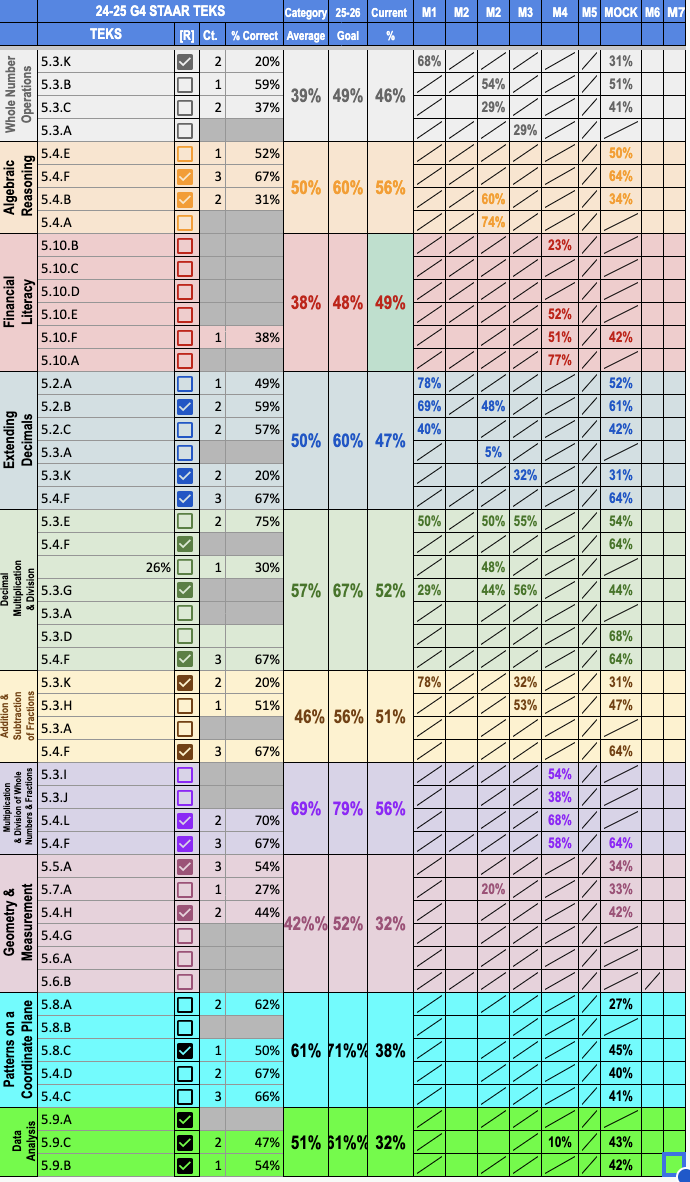This data tracking system was designed to analyze student performance at the standard level across multiple assessments. By organizing data by TEKS, this tool allows for targeted analysis of student understanding, identification of trends across assessments, and more precise instructional decision-making.