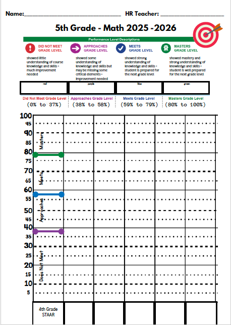 This student-facing data tracking system was designed to support transparency and ownership of learning by allowing students to monitor their performance across content areas over time. The tracker aligns performance levels to standardized proficiency bands, providing a clear visual representation of growth and progress toward mastery.